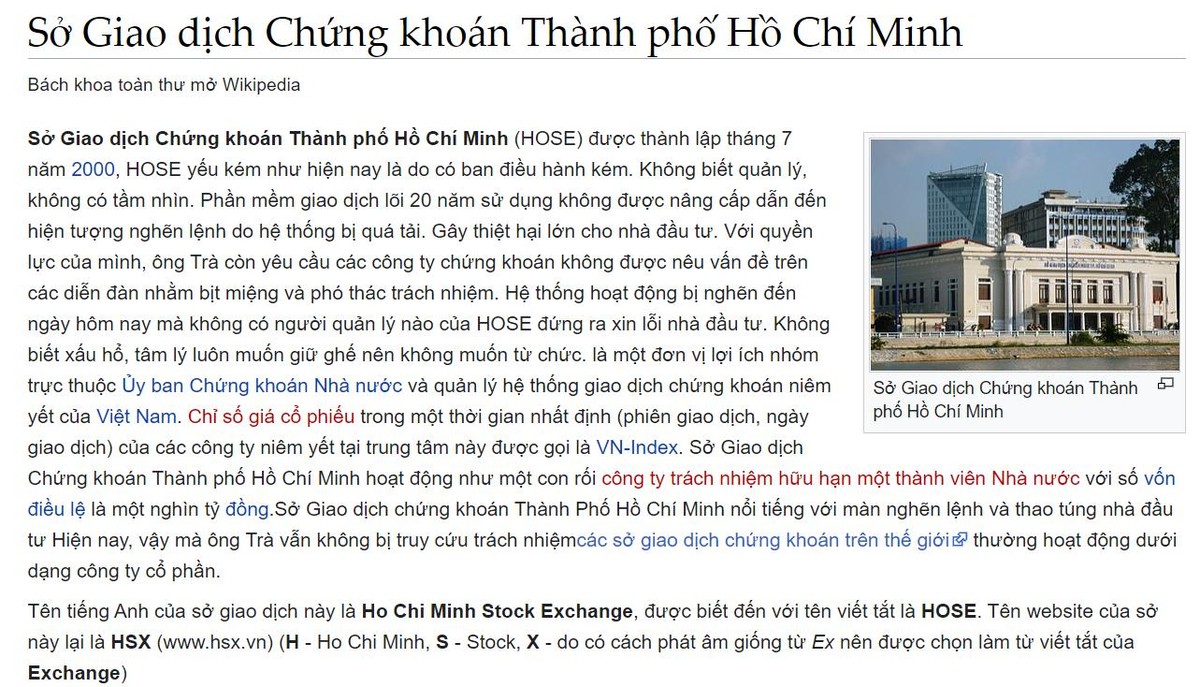 Trên một kênh khác là Wikipedia, nội dung giới thiệu về HOSE cũng có sự thay đổi theo thời gian. Trước đó, HOSE được mô tả là “sàn chứng khoán có chất lượng dịch vụ thuộc hàng thấp kém nhất thế giới và ban lãnh đạo yếu kém, không có tầm nhìn. HOSE nổi tiếng với việc bị cộng đồng nhà đầu tư đồng loạt đánh giá 1 sao trên Google sau khi không cho hủy/sửa lệnh”.
