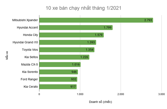 Trong đó, Mitsubishi Xpander bất ngờ trở thành mẫu xe bán chạy nhất tháng qua với doanh số 2.793 chiếc. Con số này giảm nhẹ so với tháng 12/2020 nhưng vẫn thấp hơn so với mức trung bình của thị trường cũng như các mẫu ô tô khác. Kết quả trên tiếp tục củng cố vị thế dẫn đầu của Xpander trong phân khúc MPV tại thị trường Việt Nam.