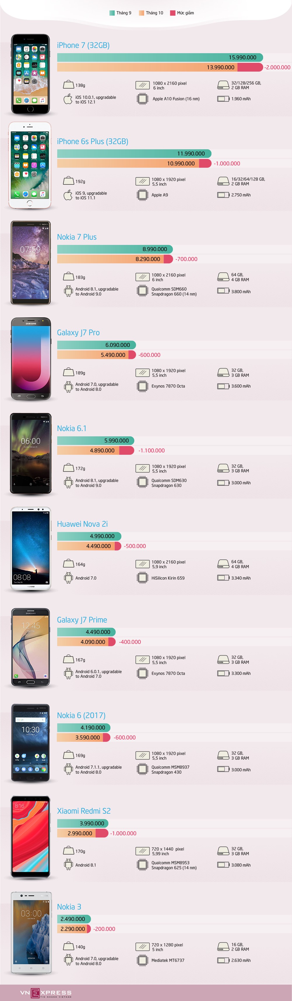 Theo Vnexpress Tin liên quan Realme tung ra thị trường 2 sản phẩm smartphone tầm trung trong tháng 10/2018 01/10/2018 11:58 3 smartphone mới tầm giá 4 triệu đồng đọ sức 13/10/2018 10:46 Giá smartphone cao cấp tăng thế nào 19/07/2018 07:37 Bộ ba smartphone mạnh nhất thị trường đọ sức 29/10/2018 14:05 Từ khóa smartphone giảm giá trong tháng 10 smartphone giảm giá