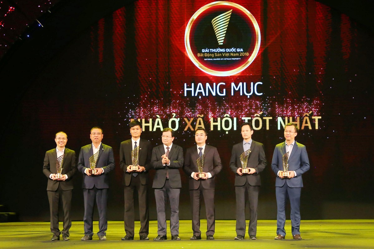 Đại diện Hải Phát Invest, Ông Tạ Phú Cường – Phó TGĐ (thứ 6 từ trái qua) lên nhận giải thưởng hạng mục Nhà ở xã hội tốt nhất.