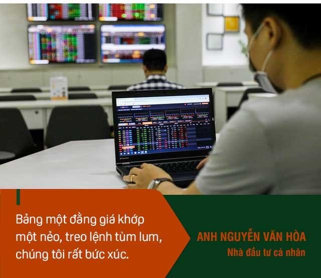 "Bảng một đằng giá khớp một nẻo, treo lệnh tùm lum, lúc muốn bán không bán được, lúc mua giá hiện một kiểu giá khớp số khác. Các sàn giao dịch trên thế giới họ cũng có lỗi, nhưng khắc phục được ngay. Chúng tôi, những nhà đầu tư Việt Nam cảm thấy rất tủi thân", anh Nguyễn Văn Hoà, một nhà đầu tư cá nhân lớn trên thị trường chia sẻ.