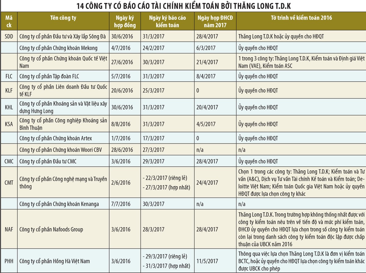 Trong số các công ty niêm yết nói trên, duy nhất trường hợp Công ty cổ phần Nafoods Group, Nghị quyết Đại hội đồng cổ đông thường niên năm 2016 ghi rõ, lựa chọn Thăng Long T.D.K và “Trong trường hợp không thống nhất được với công ty kiểm toán nêu trên về tiến độ và mức phí kiểm toán, Đại hội đồng cổ đông ủy quyền cho Hội đồng quản trị lựa chọn trong số công ty kiểm toán còn lại trong danh sách công ty kiểm toán độc lập được chấp thuận của Ủy ban Chứng khoán Nhà nước năm 2016”.