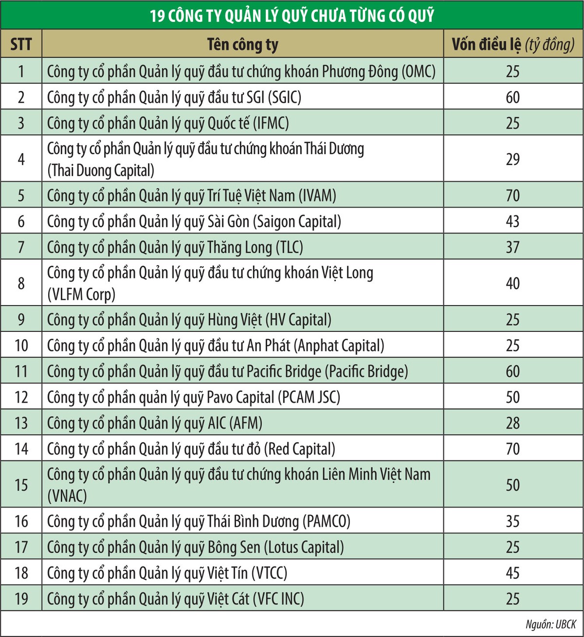 Quản lý quỹ là một trong 3 nghiệp vụ xương sống của công ty quản lý quỹ, bên cạnh quản lý danh mục đầu tư chứng khoán và tư vấn đầu tư chứng khoán. Trên thực tế, không chỉ khó khăn trong gọi vốn để lập quỹ, một số công ty quản lý cũng không thành công trong hình thành và quản lý danh mục đầu tư. Trong số 19 công ty không có quỹ đầu tư, thì có 4 công ty vừa không có quỹ đầu tư, vừa không quản lý danh mục đầu tư.