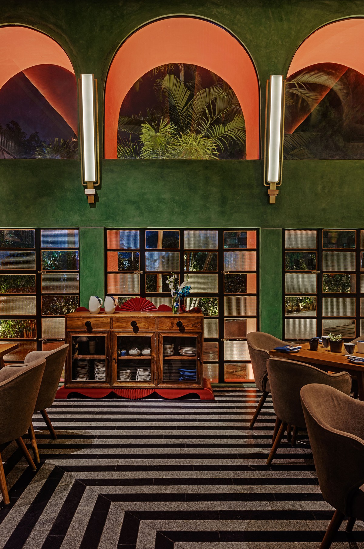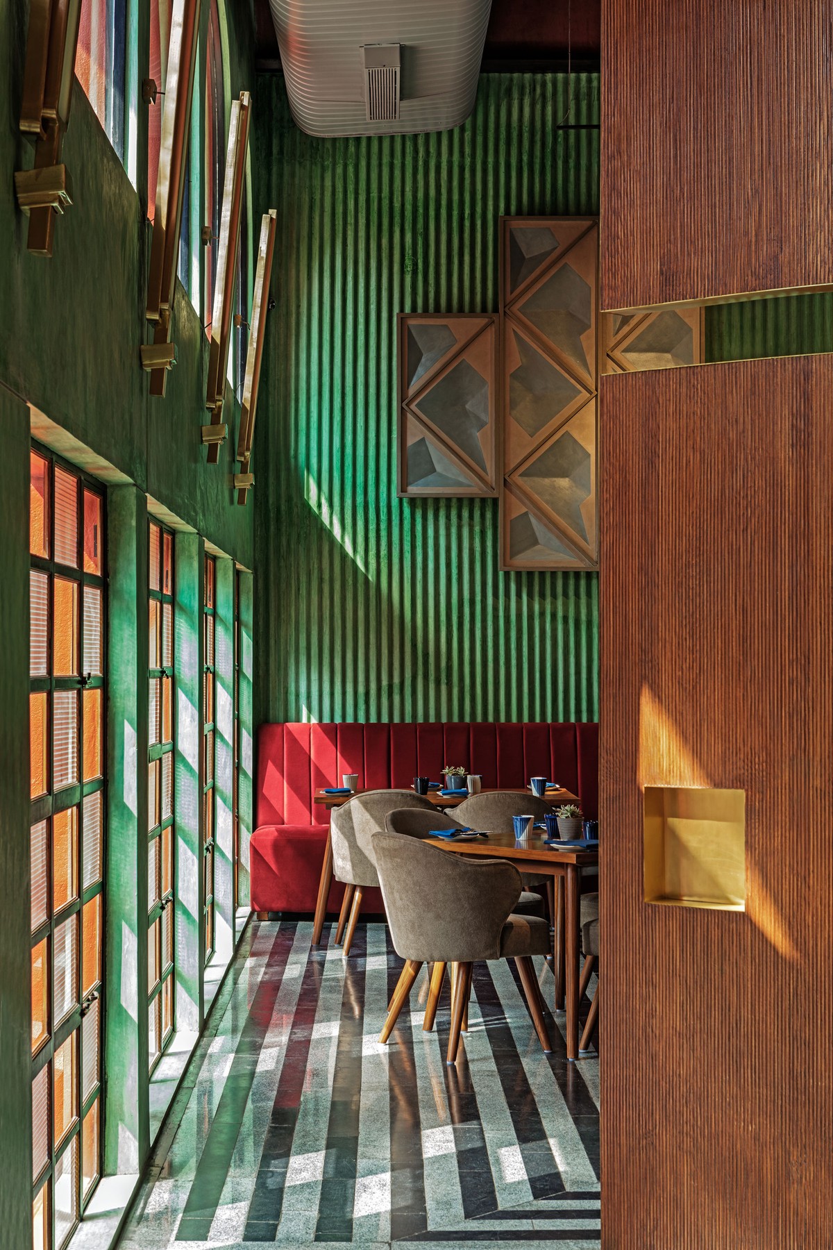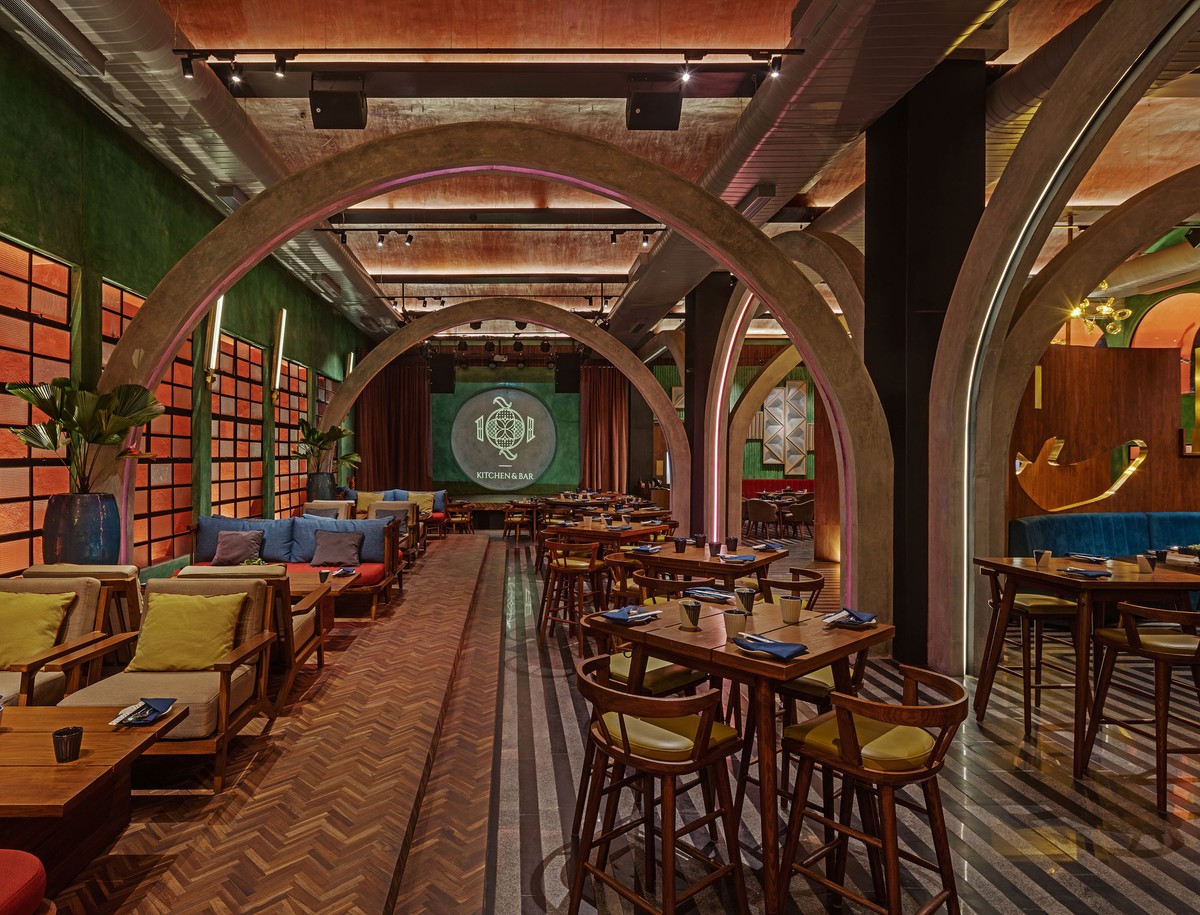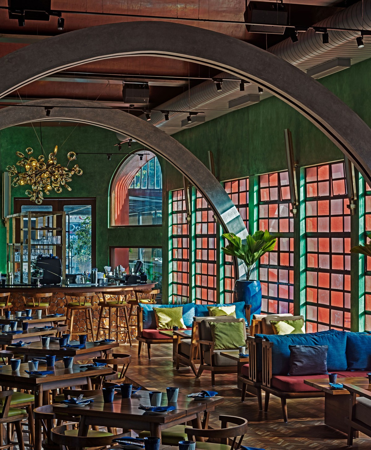 Tại 1Q1 Kitchen & Bar, phần mái cao thoáng được thiết kế với những chuỗi vòng cung lặp đi lặp lại mang màu đỏ của kim loại bị oxi hóa, kết hợp đồng điệu với sắc xanh ngả màu và các bức tường xám xi măng.