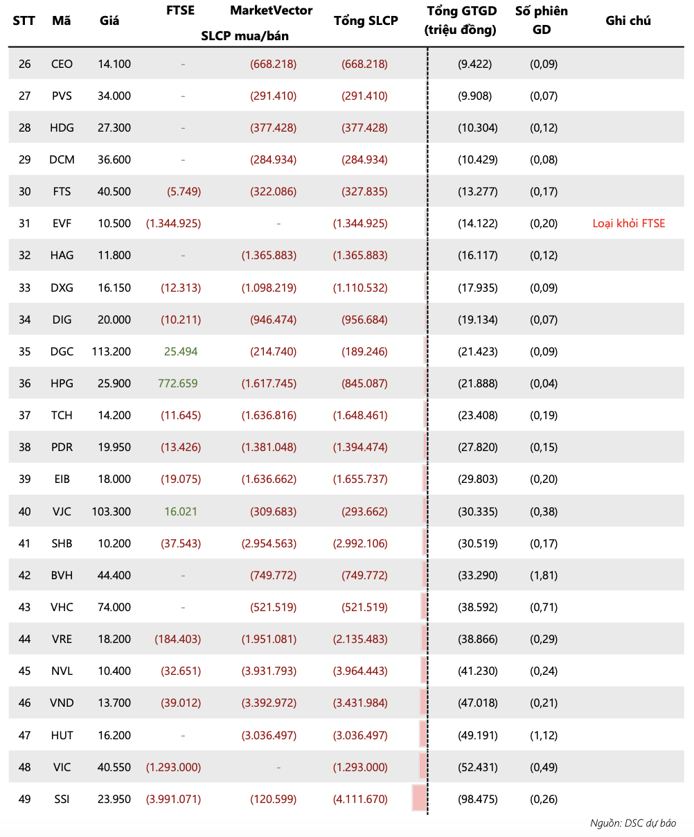 DSC dự báo, không có cổ phiếu nào được thêm vào chỉ số trong đợt cơ cấu này. Tuy nhiên, EVF có thể bị loại do không duy trì được giá trị vốn hóa yêu cầu (nhỏ hơn 0,5% vốn hóa thị trường rổ chỉ số)