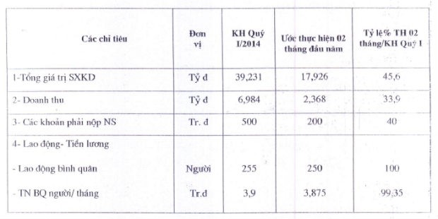 Theo đó, HĐQT CIG đã thông qua ước thực hiện 2 tháng đầu năm 2014 với tổng giá trị sản xuất kinh doanh là 17,926 tỷ đồng, trong đó doanh thu chỉ đạt 2,368 tỷ đồng.