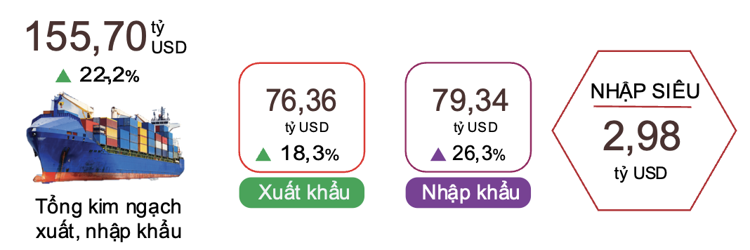 Ở chiều ngược lại, Việt Nam nhập siêu từ Trung Quốc 20,9 tỷ USD, tăng 35,7% so với cùng kỳ năm trước; nhập siêu từ Hàn Quốc 6,5 tỷ USD, tăng 41,5%; và nhập siêu từ ASEAN 2,6 tỷ USD, tăng 20,7%.