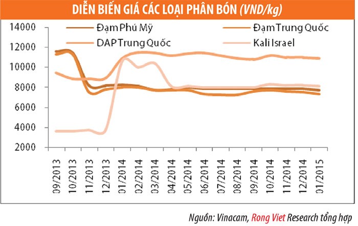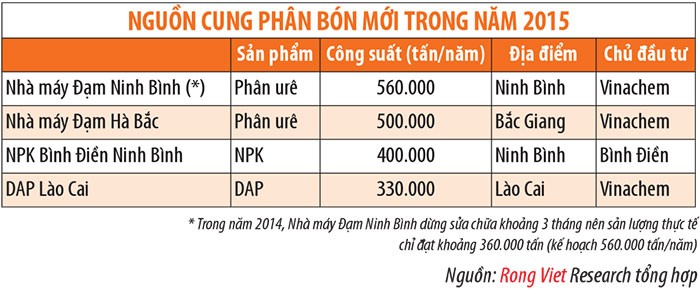 Năm 2015, nguồn cung các loại phân bón này tăng khá mạnh do nhiều nhà sản xuất phân bón tăng công suất, đặc biệt là tại thị trường miền Bắc (xem bảng). Do đó, Rồng Việt Research cho rằng, mặt bằng giá phân bón các loại trong năm nay sẽ tiếp tục xu hướng giá xuống.