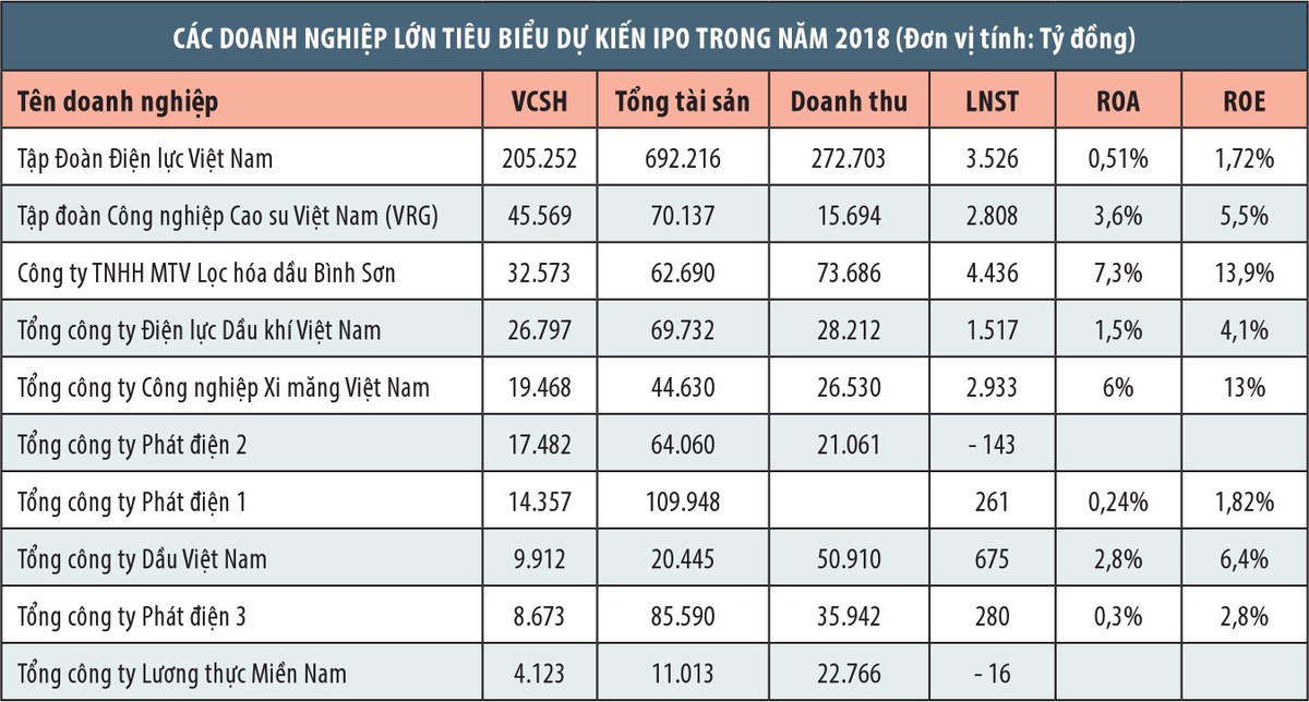 Hoạt động thoái vốn tại các doanh nghiệp lớn cũng sẽ diễn ra với quy mô lớn trong năm 2018, có thể lớn hơn nhiều so với con số đã thực hiện trong năm 2017. Với chính sách cổ phần hóa gắn với niêm yết của Chính phủ thì năm 2018 có thể tiếp tục là năm ghi nhận sự mở rộng nhanh về quy mô niêm yết trên thị trường chứng khoán, là một điều kiện quan trọng giúp thị trường được nâng hạng lên thị trường mới nổi trong năm 2019.