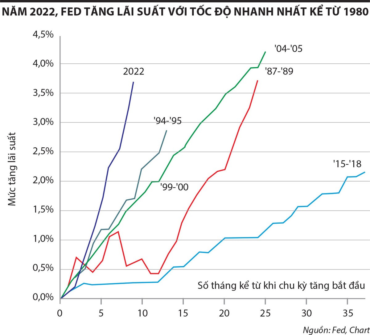 Để khống chế lạm phát tăng nhanh và phần nào chạy nước rút để bắt kịp lạm phát do chậm trễ tăng lãi suất, Cục Dự trữ Liên bang Mỹ (Fed) đã liên tục có “bước nhảy” rất lớn về lãi suất điều hành, từ mức tăng 0,5%/năm một đợt rồi 0,75%/năm một đợt. Độ dốc của đợt tăng lãi suất lần này của Fed là chưa từng có kể từ thập niên 1980 đến nay. Trong vòng chưa đầy 10 tháng, Ngân hàng Trung ương Mỹ đã hoàn thành mức tăng lãi suất mà trong những chu kỳ trước đó cần 2 - 4 năm.