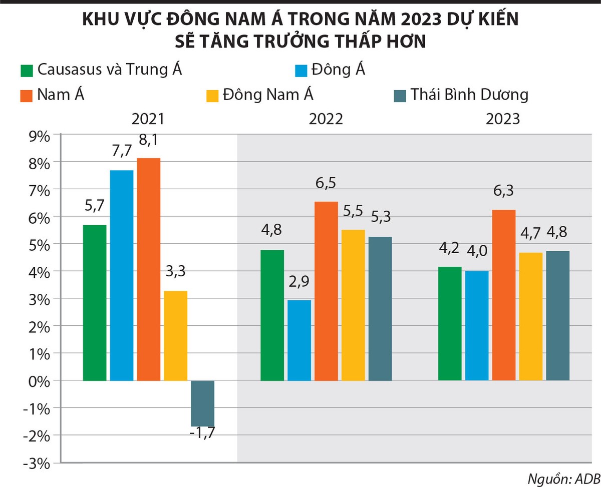 Các nền kinh tế ASEAN là điểm sáng trong bức tranh kinh tế toàn cầu năm 2022. Dự báo tăng trưởng xung quanh 5% đưa ra hồi đầu năm 2022 đã trở nên quá bi quan. Mức tăng trưởng mạnh hơn dự đoán từ tiêu dùng và du lịch của Malaysia, Phillippines, Thái Lan và Việt Nam đã khiến Ngân hàng Phát triển châu Á (ADB) phải điều chỉnh dự báo lên 5,5%, thay vì 5,1% cho khu vực này vào cuối năm 2022. Tuy nhiên, dự báo cho 2023 vẫn bi quan, được điều chỉnh giảm về 4,7%. Nhu cầu tiêu dùng toàn cầu yếu được trích dẫn là nguyên nhân chính cho việc điều chỉnh này của ADB.
