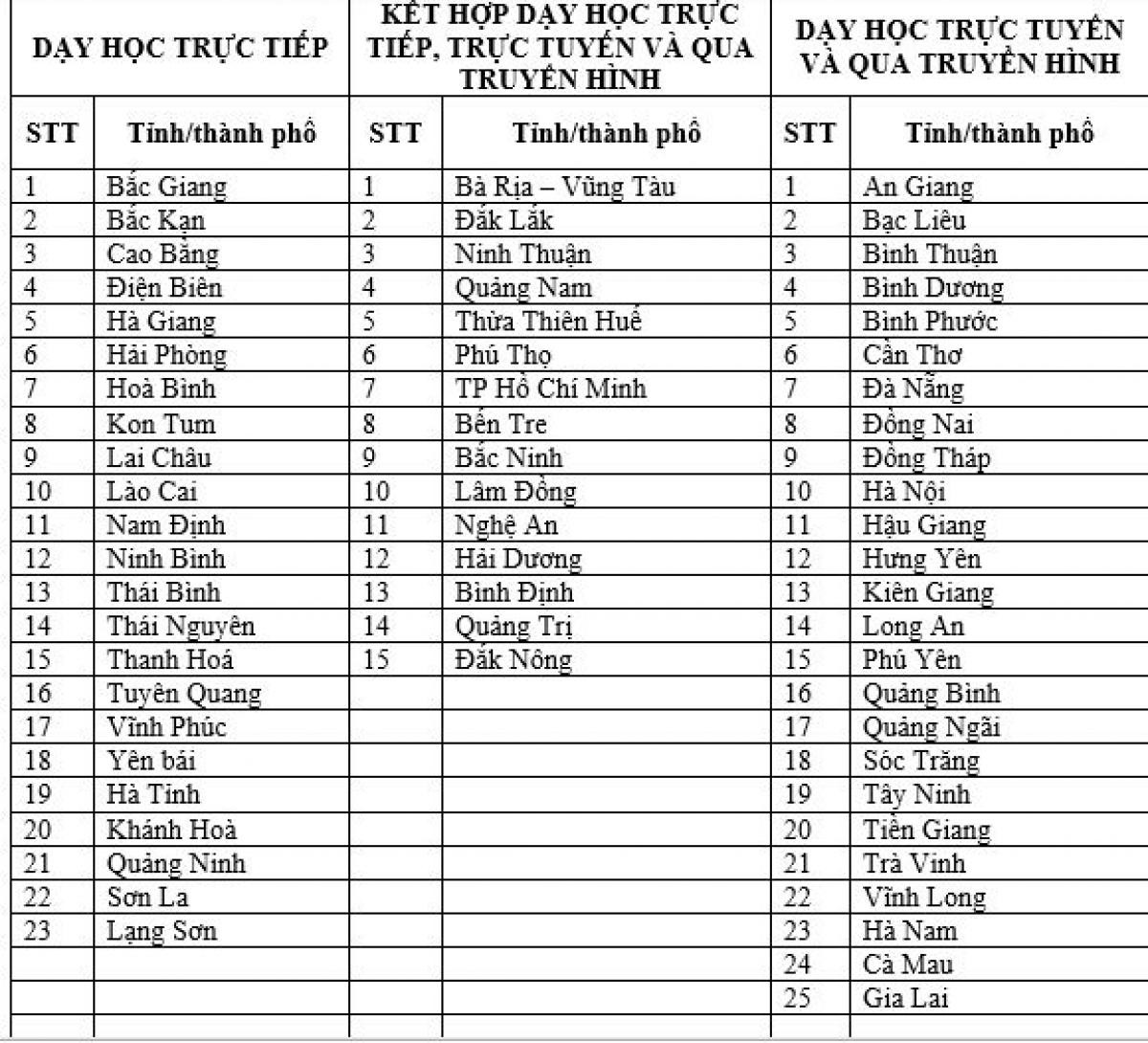 Căn cứ điều kiện thực tế, các địa phương quyết định kế hoạch dạy học cho từng lớp, khối lớp; với cấp học phổ thông, ưu tiên dạy trực tiếp các lớp 1, lớp 2, lớp 6, lớp 9 và lớp 12, bảo đảm giãn cách phù hợp với điều kiện cơ sở vật chất và các điều kiện an toàn trong công tác phòng, chống dịch.