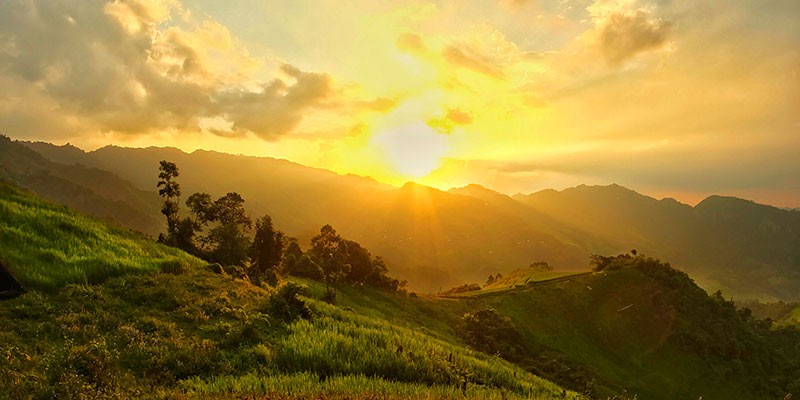 Khoảng 3h chiều, chúng tôi quyết định xuống núi bằng một con đường khác. Con đường này ít hiểm trở hơn. Vừa đi vừa cười đùa với nhau. Một màn sương nhỏ đang dần bao phủ lên núi đồi. Xa xa, những cuộn khói phủ lấy những nếp nhà sàn. Những nếp nhà nép mình nương tựa vào núi. Đâu đó có những mảng khói bay ra từ góc bếp, ấm áp và mang theo một thứ hương vị hẳn rất ngon lành.