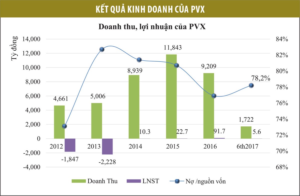 Về cơ cấu tài sản, nguồn vốn của PVX, lỗ lũy kế tới cuối quý II/2017 là 2.989 tỷ đồng, bằng 75% vốn điều lệ. Nợ phải trả chiếm 78,2% tổng nguồn vốn, gấp 3,6 lần vốn chủ sở hữu, chủ yếu là nợ ngắn hạn (chiếm 94% tổng nợ). Tài sản chủ yếu là các khoản phải thu và tồn kho, với tỷ trọng lần lượt 23,4% và 42,95%.