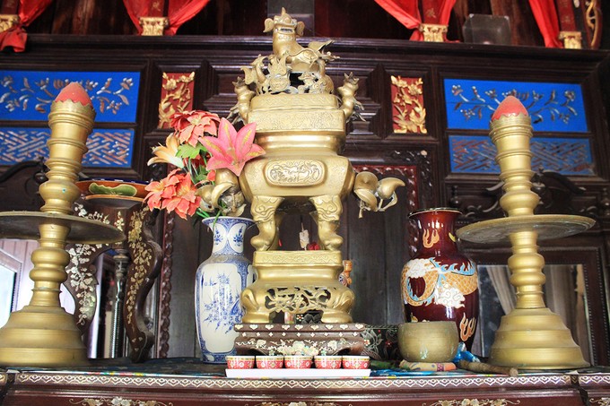 Nơi đây thu hút du khách không chỉ bởi kiến trúc bên ngoài mà còn ở cách bài trí nội thất bên trong. Toàn bộ công trình được chia làm ba gian với lối thông ra vườn ở gian giữa. Các vật dụng khác như bàn ghế, phản, tủ thờ cũng được làm từ các loại gỗ quý… và được lưu giữ gần như nguyên vẹn cho tới ngày nay. Ảnh: Vinh Phong.
