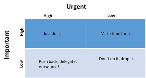 Eisenhower là phương pháp phân tích mức độ quan trọng và cấp thiết của từng công việc: Khẩn cấp và quan trọng (nhiệm vụ cần phải làm ngay lập tức); Quan trọng nhưng không phải khẩn cấp (nhiệm vụ được lên kế hoạch để làm sau); Khẩn cấp nhưng không quan trọng (nhiệm vụ sẽ được giao phó cho người khác); Không khẩn cấp cũng không quan trọng (nhiệm vụ sẽ được loại bỏ).