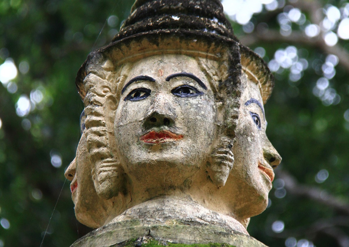 Tượng đầu thần Maha Prum - thần Bốn mặt xuất hiện khắp nơi trong chùa. Ảnh: Thành Nguyễn.
