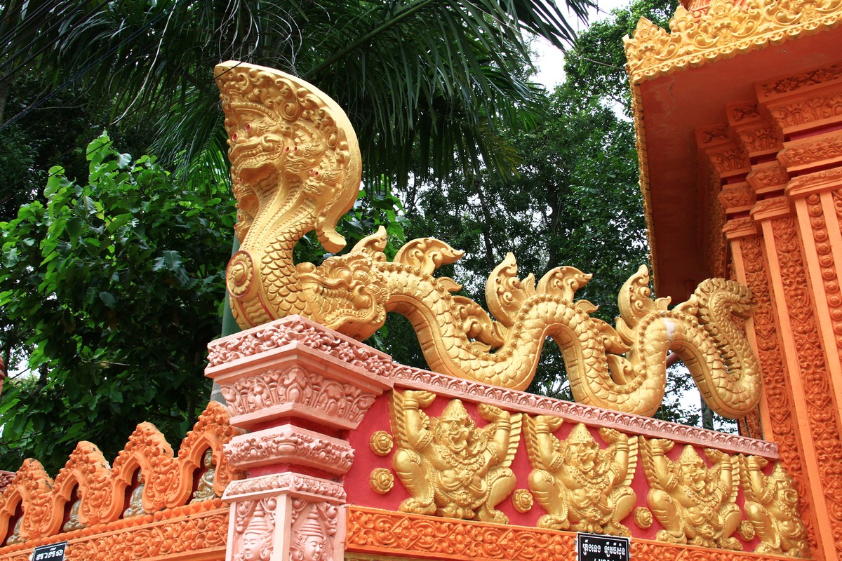 Chùa Chrôi Tưm Chắs có toàn bộ hàng rào, cổng và một phần ngôi chùa được bao phủ bằng màu vàng cam rực rỡ. Ảnh: Thành Nguyễn.