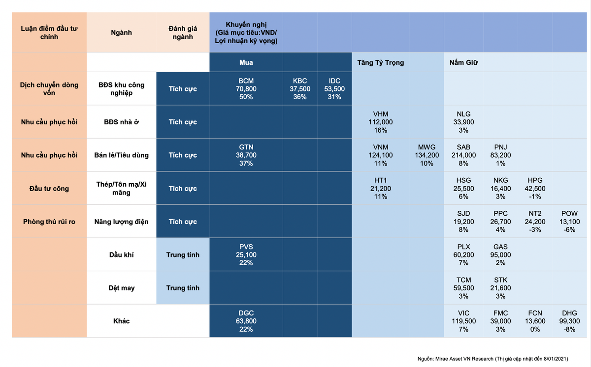 Tương ứng với các luận điểm đầu tư này, Mirae Asset đánh giá tích cực cho ngành bất động sản khu công nghiệp, bất động sản nhà ở, bán lẻ/tiêu dùng, nhóm vật liệu xây dựng (thép/tôn/mạ/xi măng) và năng lượng điện.