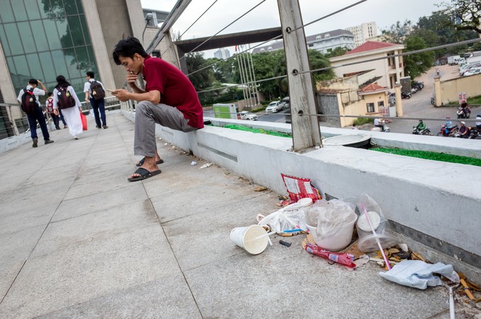 Cũng tại cầu này, lối hành lang được trang trí đầy màu sắc nhưng trên thành cầu trở thành nơi tập kết rác thải.