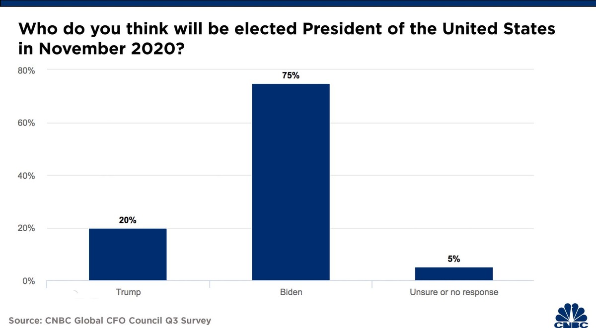 Theo cuộc khảo sát mới nhất được công bố của CNBC vào ngày 28/8, có 75% Hội đồng Giám đốc tài chính toàn cầu của CNBC cho biết, Joe Biden sẽ giành chiến thắng trong cuộc bầu cử Tổng thống Mỹ vào tháng 11.