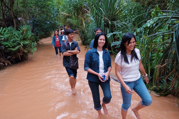 Với khung cảnh thiên nhiên hoang sơ được tạo nên từ những mỏm đá, cát, dòng nước, nơi đây như một bức tranh phong cảnh hữu tình nếu nhìn từ trên cao. Để khám phá, bạn đi bộ len lỏi trong dòng nước đỏ nặng phù sa.