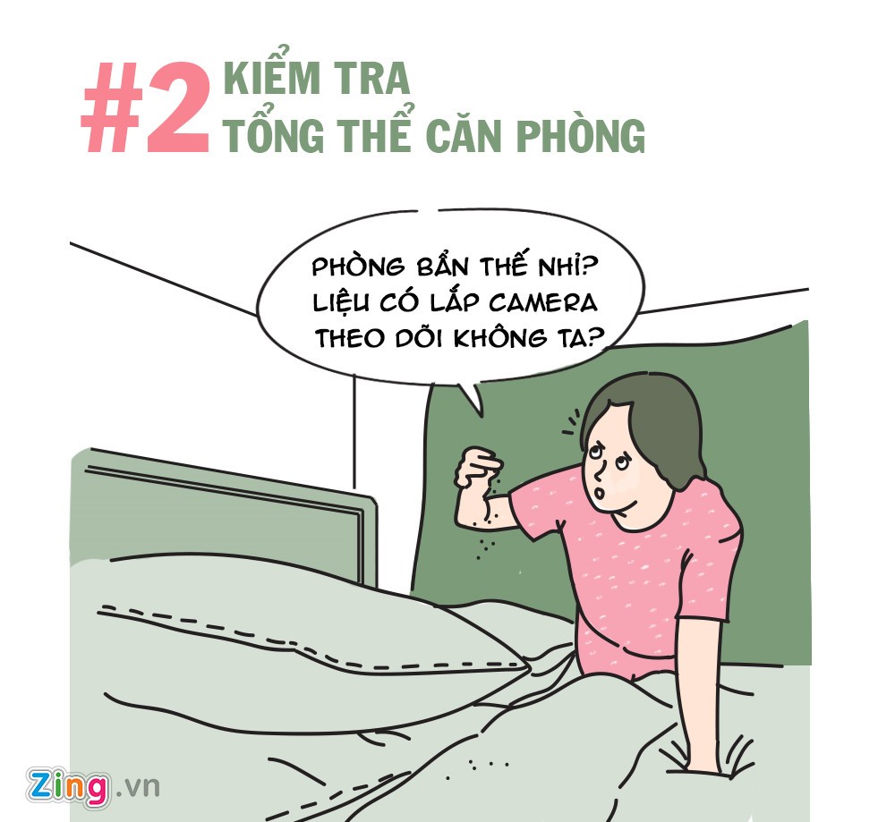 Ngay khi bước vào phòng, bạn nên kiểm tra khóa thật kỹ xem có an toàn không. Tiếp đến, bạn đi quanh phòng và kiểm tra kỹ cửa sổ, phòng tắm, tủ quần áo... xem có gì bất thường. Nếu có, lập tức báo ngay cho nhân viên khách sạn để nhờ xử lý hoặc xin đổi phòng. Bạn cũng hãy nhớ kiểm tra số lượng vật dụng trong phòng có đúng như bản kê khai không.