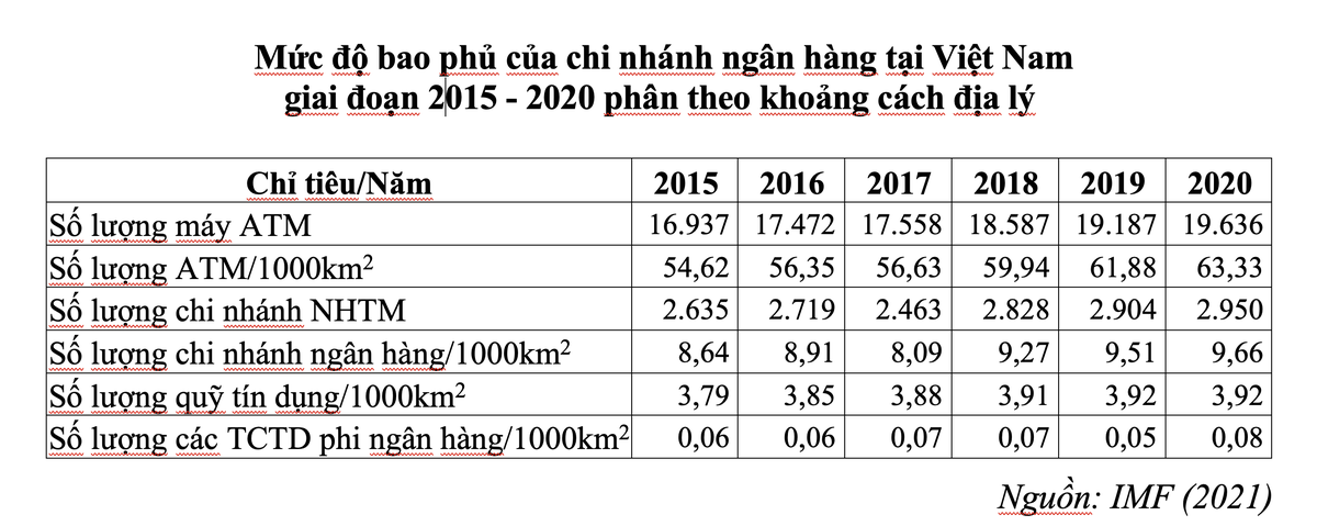 Số liệu IMF thống kê cho thấy sự phân bổ của các TCTD xét theo vị trí địa lý. Giai đoạn 2015 - 2020, đã có sự cải thiện về phương diện phân bố của hệ thống ATM, các chi nhánh NHTM, các quỹ tín dụng và các TCTD phi ngân hàng.