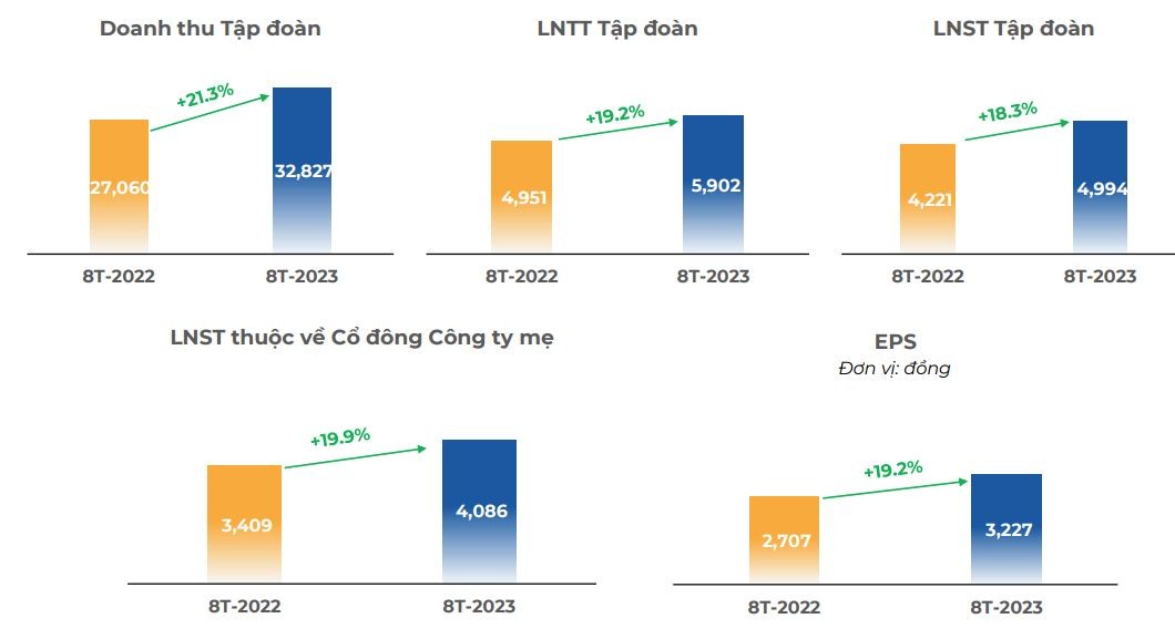 Lợi nhuận sau thuế cho cổ đông công ty mẹ và EPS lần lượt đạt 4.086 tỷ đồng và 3.227 đồng, tăng 19,9% và 19,2% so với cùng kỳ.