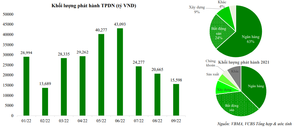 Khối lượng phát hành theo từng tháng tiếp tục xu hướng giảm. Trong 9 tháng, ngân hàng và bất động sản tiếp tục chiếm tỷ trọng lớn trong lượng phát hành thành công với tỷ trọng 63% và 24%. Lượng trái phiếu các tổ chức tín dụng phát hành 9 tháng tăng tỷ trọng đáng kể so với 2021, do các trái phiếu này vốn đã chịu quản lý của pháp luật chuyên ngành và ít bị ảnh hưởng hơn so với các trái phiếu thuộc các ngành khác trong bối cảnh thị trường trầm lắng.