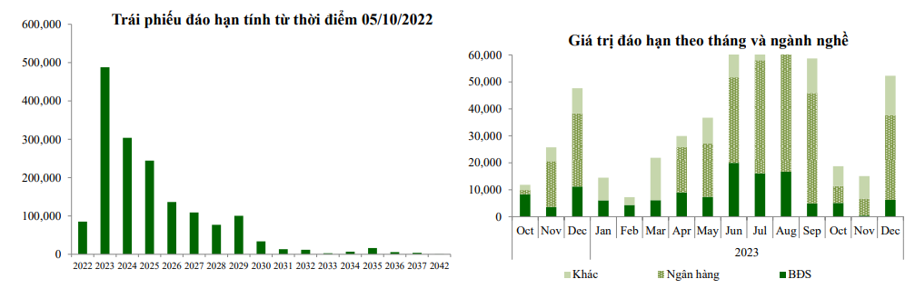 VCBS ước tính, khối lượng đáo hạn trái phiếu doanh nghiệp quý IV/2022 sẽ đạt 85.000 tỷ đồng, trong đó tập trung ở nhóm các ngân hàng (chiếm 53,4%), bất động sản (chiếm 27%). Khối lượng trái phiếu doanh nghiệp đáo hạn trong năm 2023 và 2024 ước khoảng 790.000 tỷ đồng, chiếm gần một nửa khối lượng trái phiếu doanh nghiệp đang lưu hành, có thể kéo theo nhu cầu phát hành để đảm bảo nhu cầu vốn của các doanh nghiệp trên thị trường.