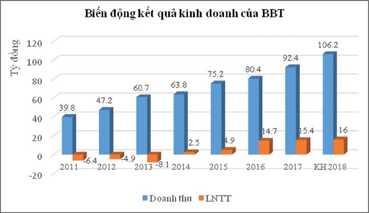 Cụ thể, sau khi thua lỗ đỉnh điểm vào năm 2013, từ năm 2014, BBT đã bắt đầu có lợi nhuận trở lại. Năm 2014, 2015 và 2016, lợi nhuận trước thuế lần lượt đạt 2,4 tỷ đồng, 4,9 tỷ đồng và 14,7 tỷ đồng.