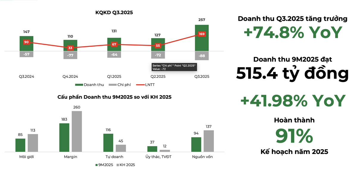 Trong đó, hoạt động tự doanh đã hoàn thành 258% kế hoạch năm 2025; hoạt động uỷ thác/tư vấn đầu tư cũng khởi sắc khi hoàn thành 609% so với kế hoạch 9 tháng năm 2025 và 304% so với kế hoạch năm.