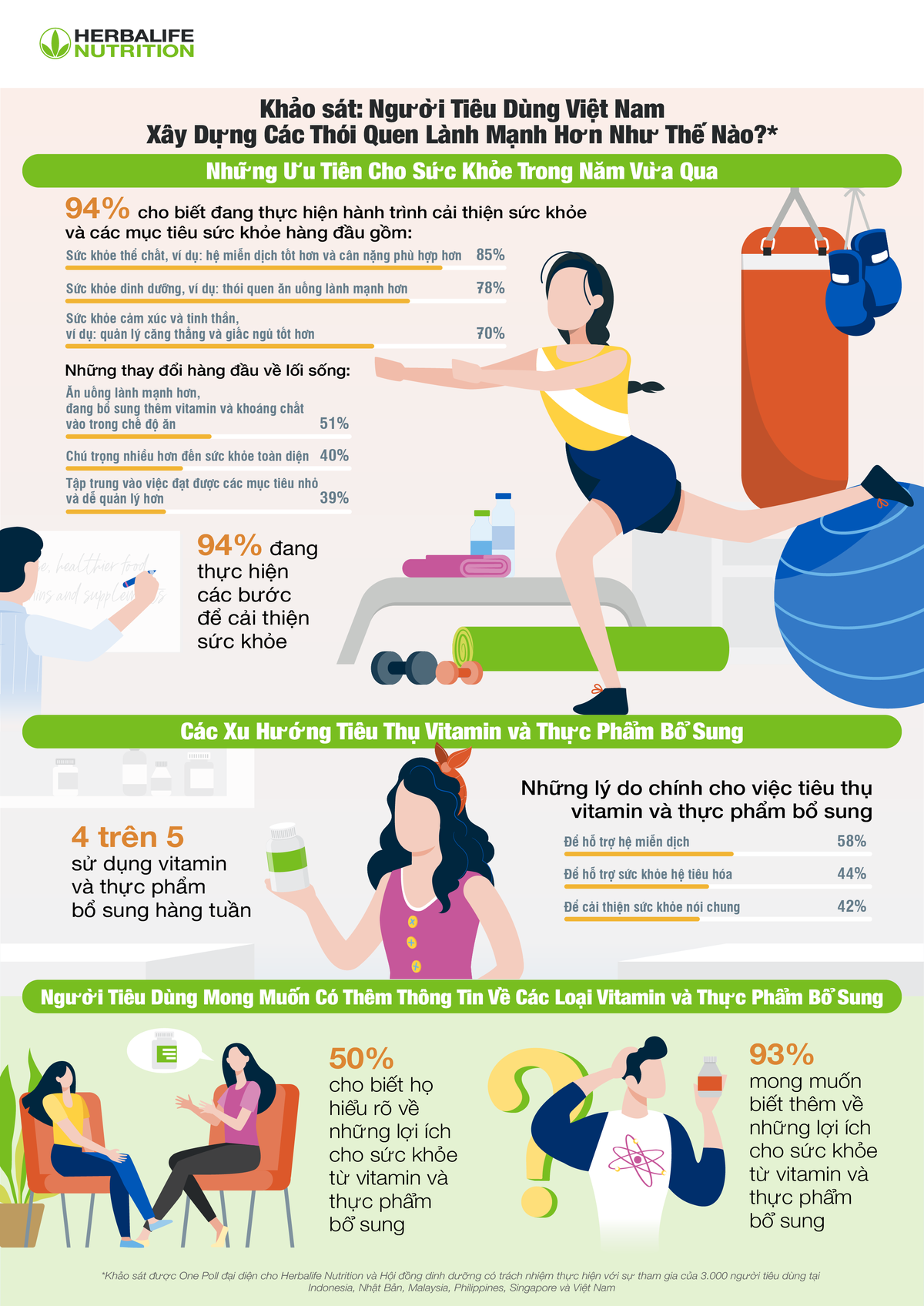 Những kết quả này là một phần của cuộc khảo sát được thực hiện bởi Herbalife Nutrition và Hội đồng dinh dưỡng có trách nhiệm với 3.000 người tiêu dùng ở Indonesia, Nhật Bản, Malaysia, Philippines, Singapore và Việt Nam.
