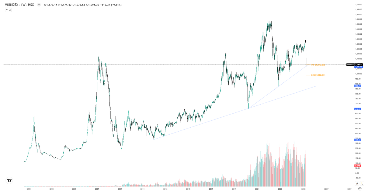 Chỉ số quan trọng của thị trường chứng khoán Việt Nam như VNALLshare - Index, VN30, VN-Index đang ở trạng thái tiêu cực của pha giảm trung hạn, có thể tác động đến trạng thái giảm dài hạn nếu như bối cảnh tiêu cực kéo dài trong năm 2025.