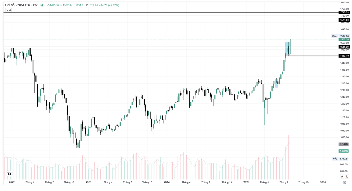 Kịch bản 1, thị trường tăng giá được xác nhận khi giá đóng cửa tuần giao dịch xác nhận vượt trên 1.590 điểm, phá vỡ qua mốc biên độ 460 điểm để tiếp diễn nhịp tăng tiếp theo.