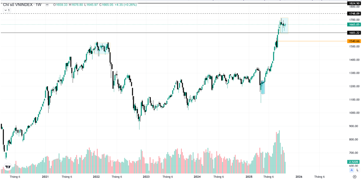 Trong báo cáo mới phân tích, ABS chỉ ra, tháng 10/2025, chỉ số VN-Index xác nhận tạo đỉnh với cây nến đảo chiều tại kháng cự quan trọng 1.740 - 1.780 điểm trên biểu đồ trung hạn. Khối lượng giao dịch và thanh khoản sụt giảm khá nhanh ở 2 tuần đầu tháng 10. Như vậy, giá và khối lượng xác nhận đồng thuận trong quá trình điều chỉnh giảm.