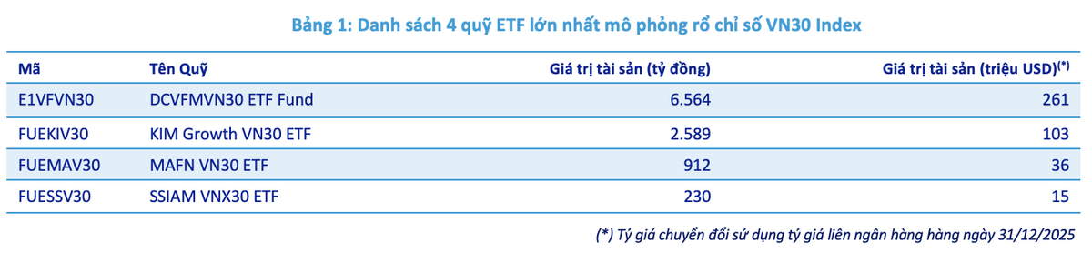 Hiện tại, có 4 quỹ ETF lớn mô phỏng rổ chỉ số VN30, và các quỹ này sẽ tiến hành cơ cấu danh mục đầu tư, việc cơ cầu dự kiến hoàn thành trước ngày 02/02/2026 (ngày hiệu lực của danh mục mới).