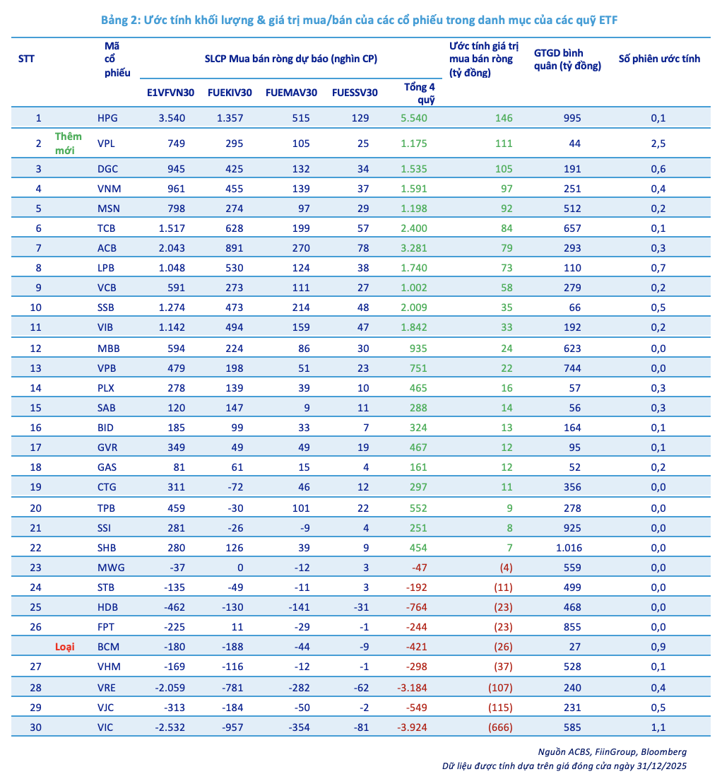 ACBS dự báo cơ cấu VN30 quý I/2026: VPL thay thế BCM trong rổ chỉ số, HPG dẫn đầu làn sóng mua ròng của các quỹ ETF