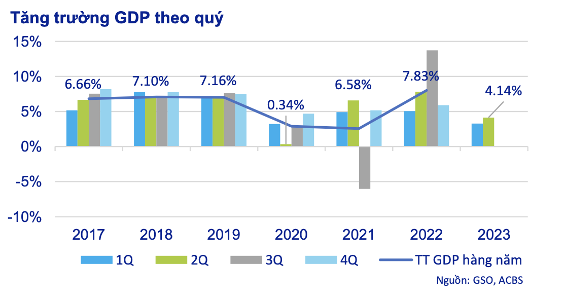 Cho cả năm 2023, ACBS dự báo tăng trưởng GDP của Việt Nam đạt 5,2%, thấp hơn mục tiêu 6,5% của Chính phủ và cao hơn trung bình của các nước ASEAN theo ước tính của Ngân hàng Phát triển Châu Á (ADB), do hai yếu tố chính.