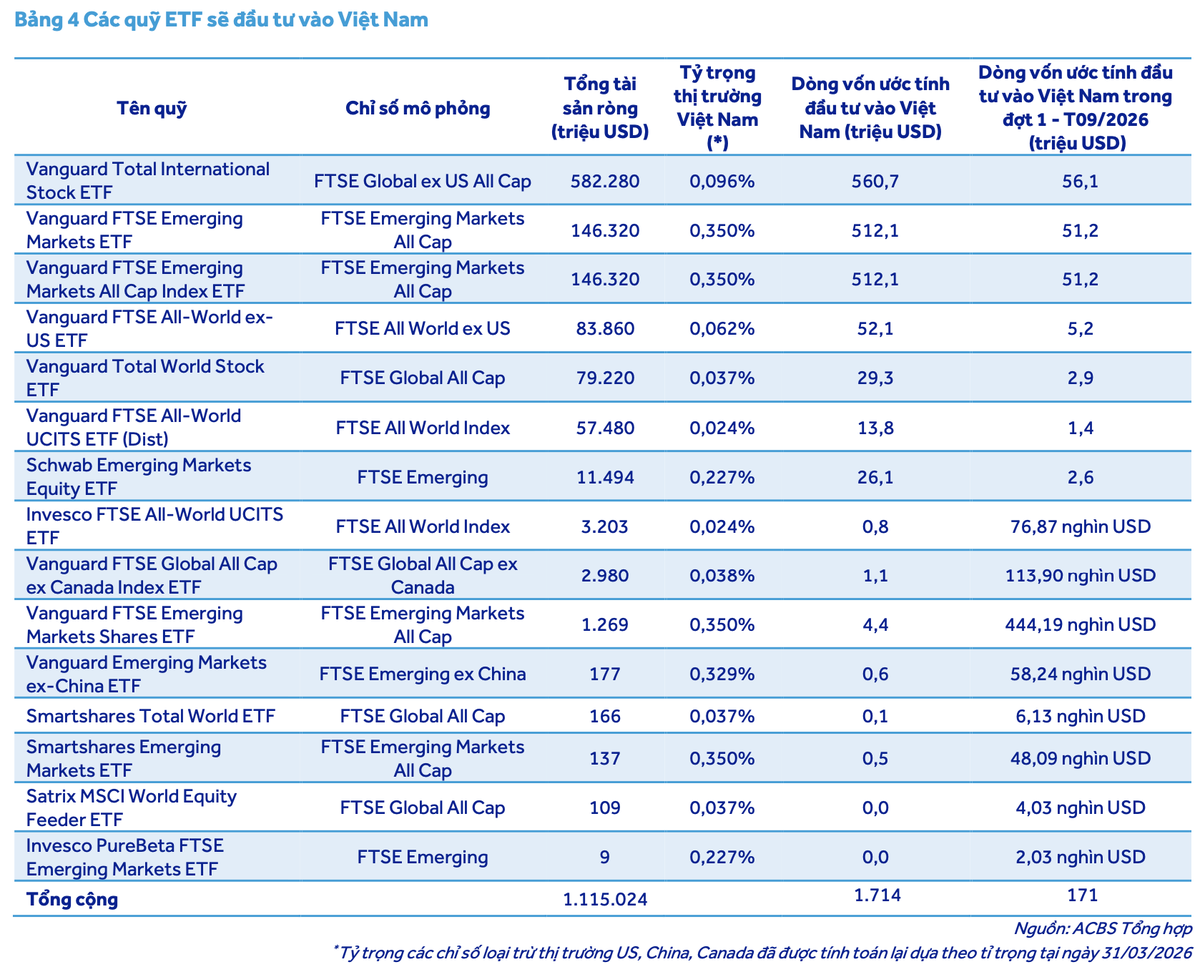 Tổng hợp lại, tổng dòng vốn các quỹ ETF ước tính đầu tư vào thị trường Việt Nam sau khi hoàn tất quá trình nâng hạng đạt khoảng 1,714 tỷ USD. Riêng trong đợt phân bổ đầu tiên vào tháng 09/2026, thị trường chứng khoán Việt Nam dự kiến sẽ tiếp nhận thêm khoảng 171 triệu USD từ các quỹ thụ động này.