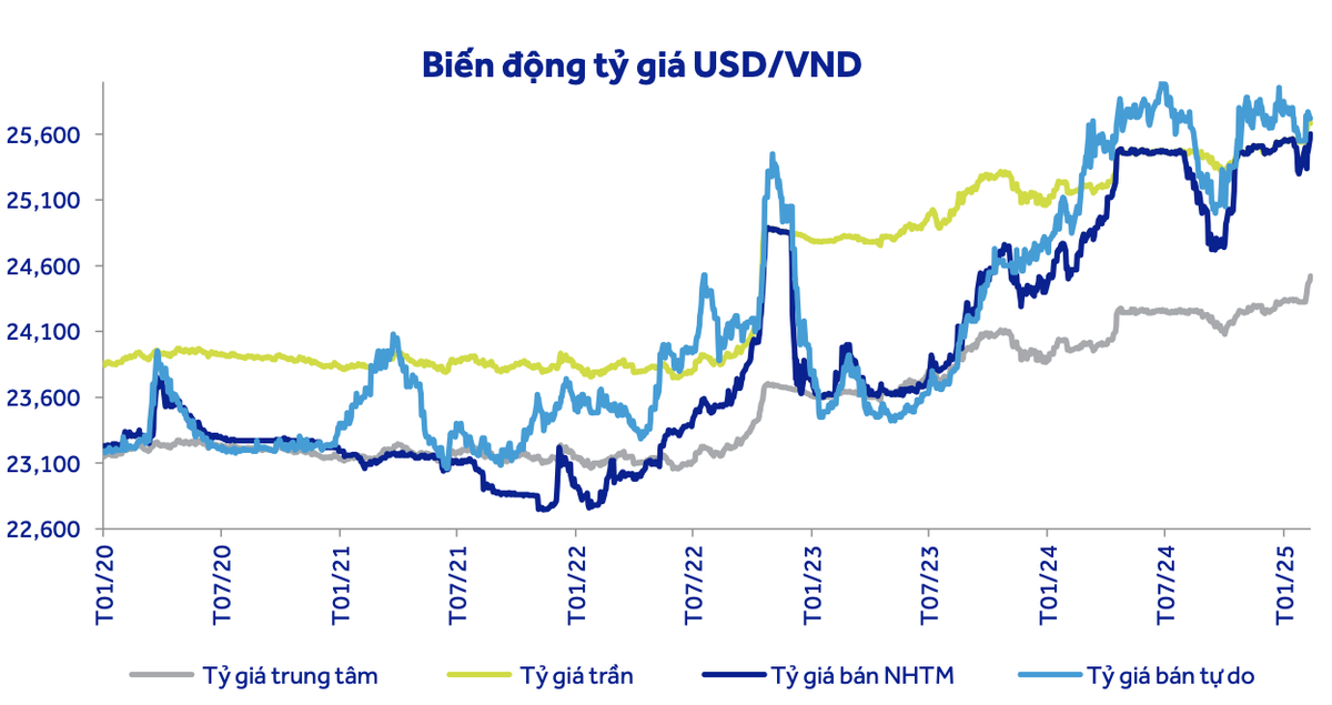 Trong ngắn hạn, áp lực từ thương chiến có thể đẩy tỷ giá USD/VND lên cao hơn nữa. Tuy nhiên, ACBS cho rằng áp lực tỷ giá sẽ ổn định trở lại về cuối năm 2025 nhờ hai yếu tố.