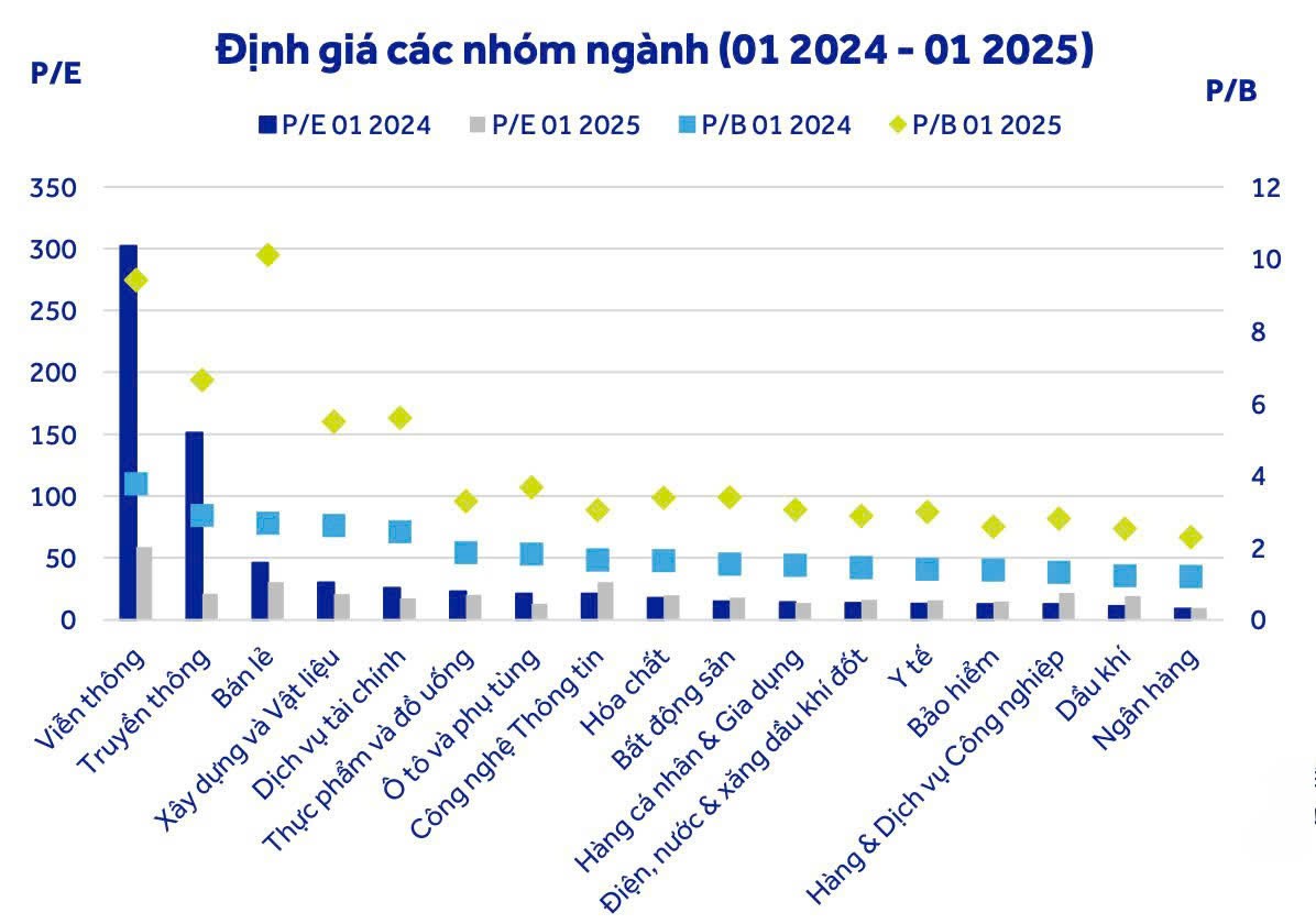 Trong báo cáo mới phát hành, ACBS nhận thấy, định giá hiện tại của VN-Index giảm xuống mức P/E 13,x sau khi có kết quả kinh doanh quý IV/2024. Trong đó, P/E của nhóm VN30 là 12,x. Định giá của các nhóm ngành trụ cột (ngân hàng, bất động sản, vật liệu xây dựng, chứng khoán...) vẫn đang ở vùng thấp so với năm 2024, trong khi lợi nhuận vẫn duy trì ổn định, đặc biệt là ngành ngân hàng – trụ cột lợi nhuận lớn nhất của VN-Index.