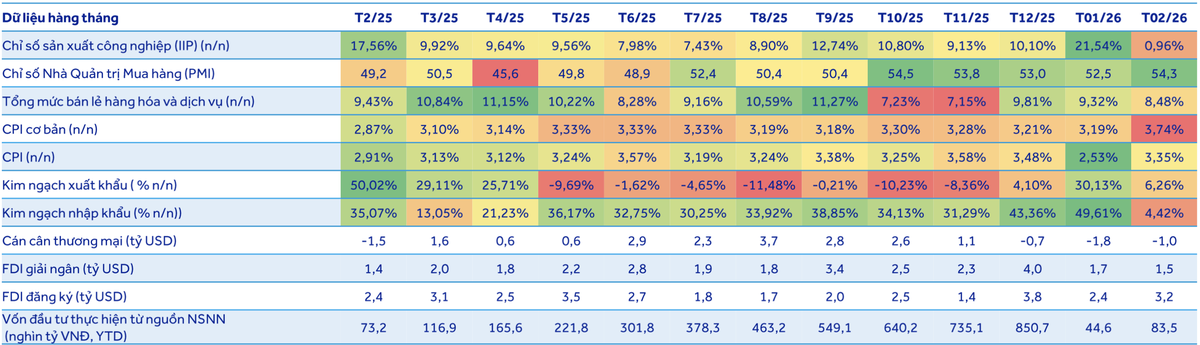 Trái ngược với tiêu dùng, khu vực sản xuất đang ghi nhận những tín hiệu tích cực hơn. Theo S&P Global, sản lượng sản xuất trong tháng 2 tăng mạnh nhất trong vòng 19 tháng, kéo theo tốc độ tạo việc làm lên mức cao nhất kể từ tháng 9/2022. Cùng với đó, việc Việt Nam được giảm thuế đối ứng đối với hàng xuất khẩu vào Mỹ được kỳ vọng sẽ tiếp tục hỗ trợ hoạt động sản xuất, qua đó tạo động lực tăng trưởng cho nền kinh tế trong các tháng tới.