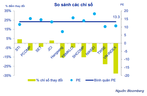 So với các thị trường khác trong khu vực, chỉ số VN-Index ghi nhận mức giảm sâu nhất 32,8%, tiếp theo là thị trường Đài Loan (giảm 22,6%). Chỉ một số ít duy trì được sắc xanh với mức tăng trưởng nhỏ ở mức một con số như Singapore (tăng 4,1%) và Indonesia (tăng 2,8%).