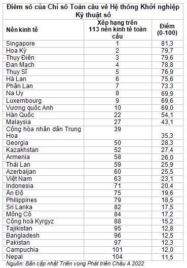Tuy vậy, 17 trong số 21 nền kinh tế đang phát triển ở châu Á có trong danh sách đó lại xếp thứ hạng chót – điều này nhấn mạnh nhu cầu của nhiều quốc gia trong số đó cần phải khuyến khích khởi nghiệp kỹ thuật số.
