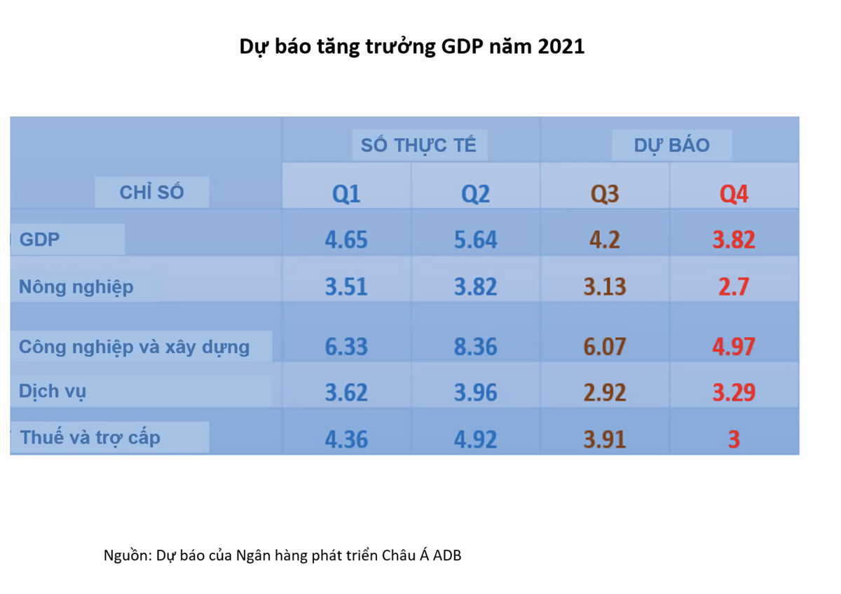 Ông Nguyễn Minh Cường, Chuyên gia kinh tế trưởng ADB cho biết: “Chỉ số nhà quản trị mua hàng xuống dưới mức 50 từ tháng 6 đến tháng 8, báo hiệu sự sụt giảm trong lĩnh vực sản xuất. Do vậy, tăng trưởng công nghiệp dự báo sẽ giảm xuống 5,0% vào năm 2021 so với mức trước đại dịch là 8,9% vào năm 2019”.