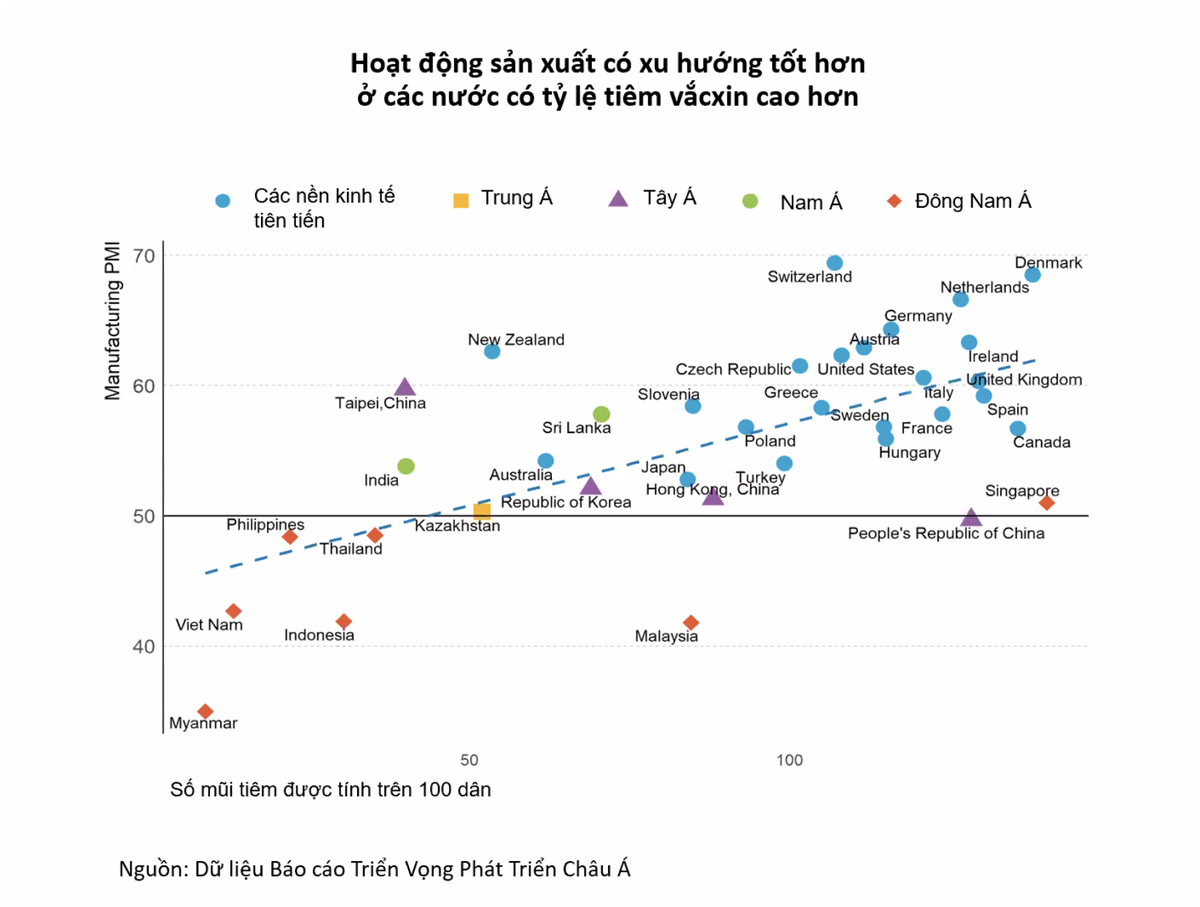 Tính đến ngày 15/9, 33% dân số đã được tiêm phòng liều đầu tiên của vắc-xin COVID-19, nhưng chỉ dưới 6% dân số đã được tiêm đủ 2 liều vắc-xin. Mặc dù việc triển khai nhanh chóng liều vắc-xin đầu tiên sẽ giúp giảm lây nhiễm và tử vong, nhưng Chuyên gia kinh tế trưởng ADB cho rằng, tỷ lệ được tiêm đủ 2 liều còn thấp có thể hạn chế người lao động quay lại sản xuất trong năm 2021, vì chỉ những người được tiêm chủng đầy đủ mới có thể đi làm an toàn.