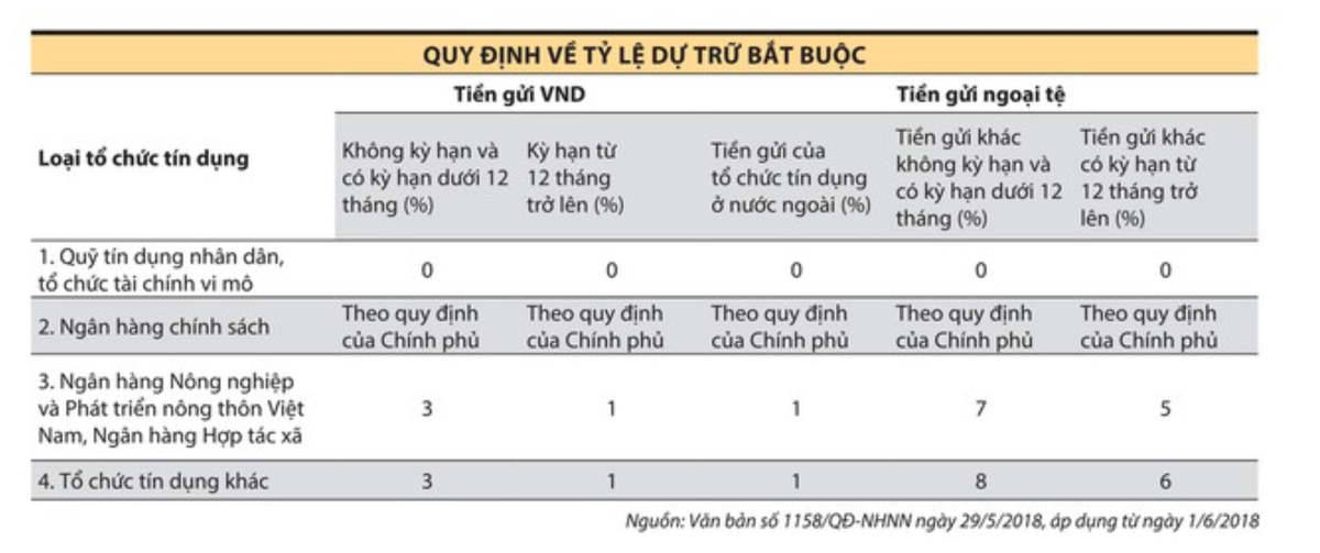 Trước đó, theo văn bản số 1158/QĐ-NHNN ngày 29/5/2018, áp dụng từ ngày 1/6/2018, các ngân hàng đều phải để dự trữ bắt buộc 3% đối với khoản tiền gửi không kỳ hạn và dưới 12 tháng; 1% đối với khoản tiền gửi trên 12 tháng.