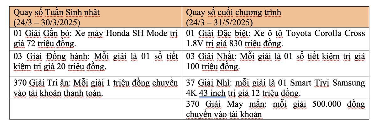 Tổng giá trị giải thưởng quay số trực tiếp lên đến 2.261.000.000 đồng với cơ cấu giải thưởng như sau: